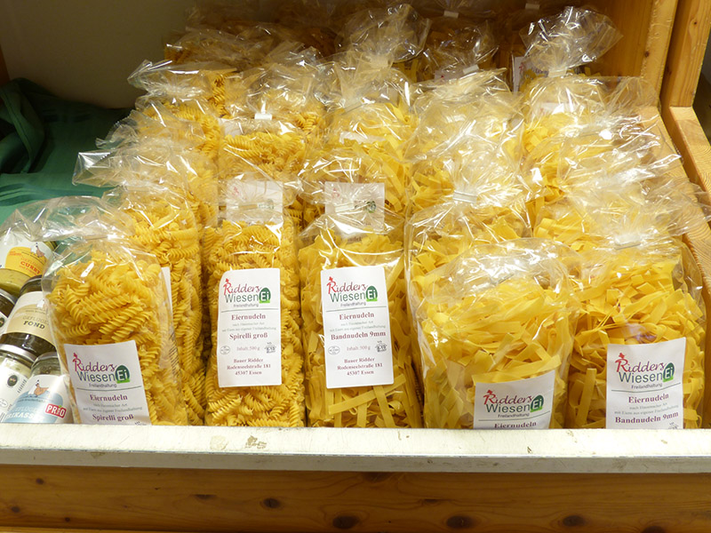 Auch unsere Nudeln sind mit unseren eigenen Wieseneiern produziert und haben einen besonders hohen Ei-Anteil von etwa 30 %. Das macht sie so schön goldgelb und lecker. Als Bandnudeln schmecken sie besonders toll zu Fleisch und kräftigen Soßen, in Spirelli-Form sind sie perfekt für Gemüse-Nudel-Pfannen.