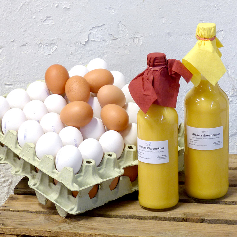 Seit Jahren ein absoluter Kundenliebling: unser hausgemachter Eierlikör! Hergestellt aus unseren eigenen Eiern, veredelt er mit seinem cremig-süßen Geschmack jede Nachspeise – ganz gleich ob Eiscreme oder lauwarmer Apfelstrudel. Aber auch pur oder als weihnachtlicher Eierpunsch ist er ein absoluter Genuss.